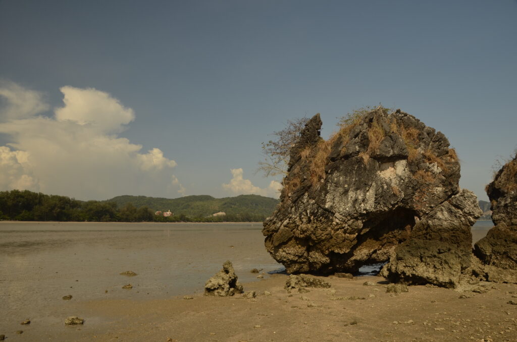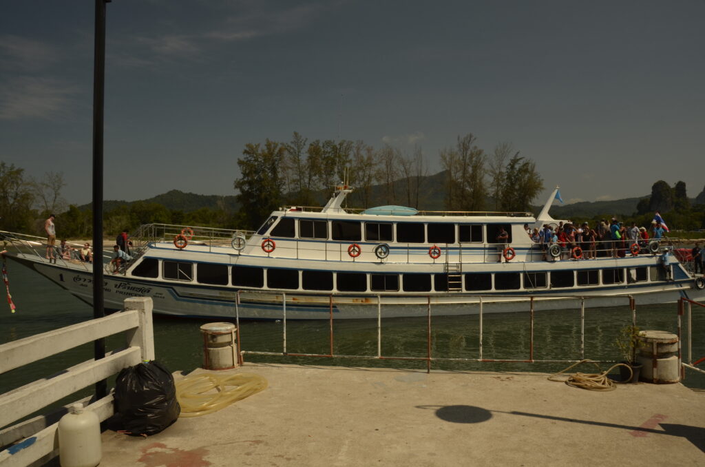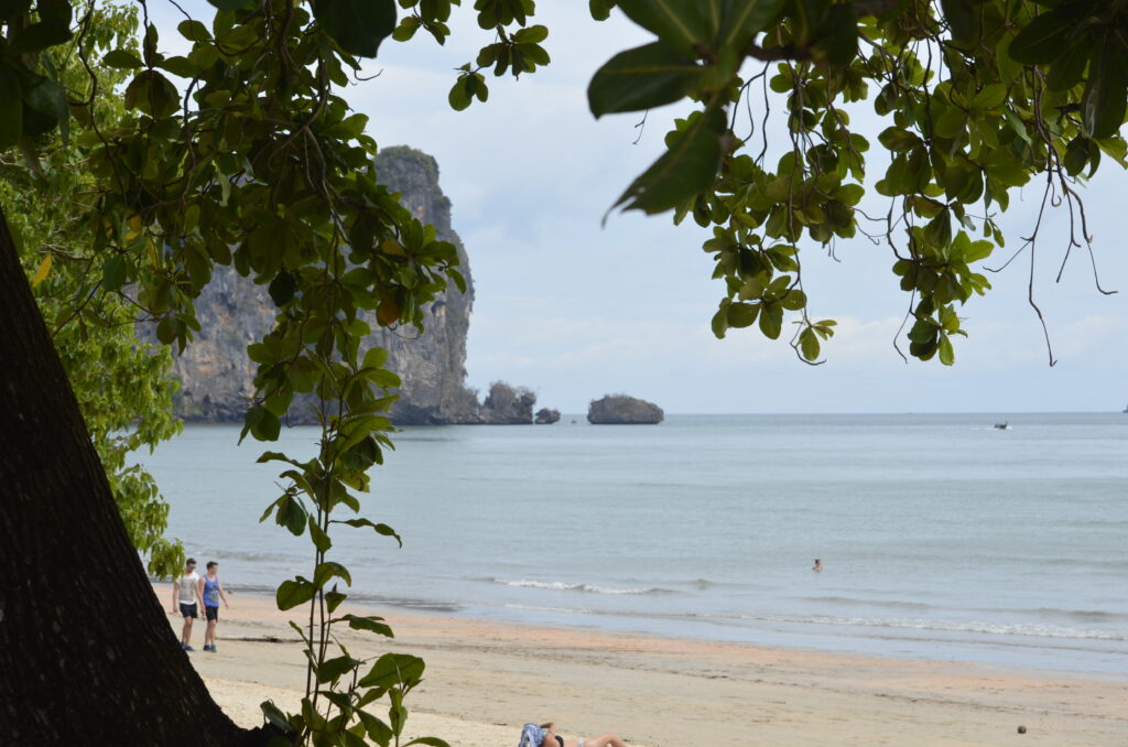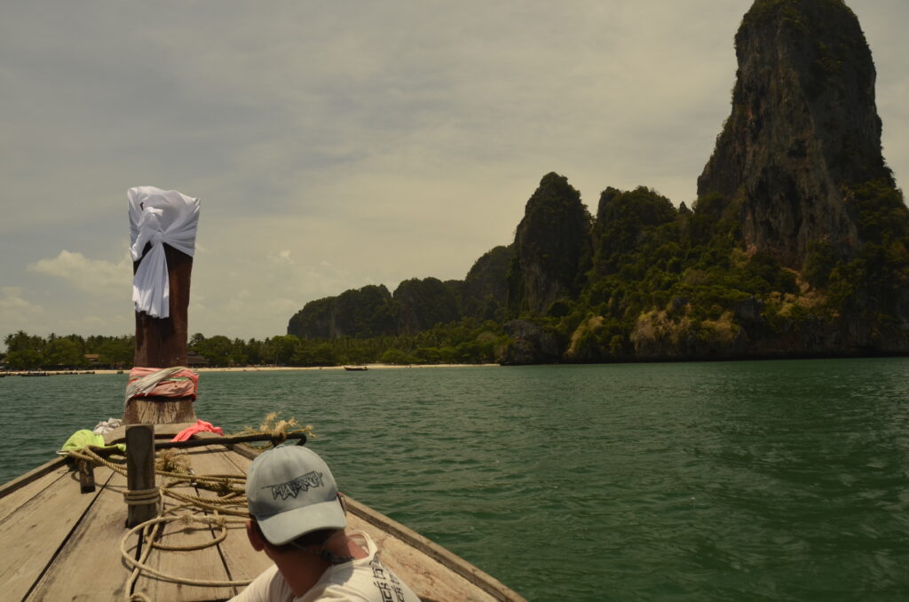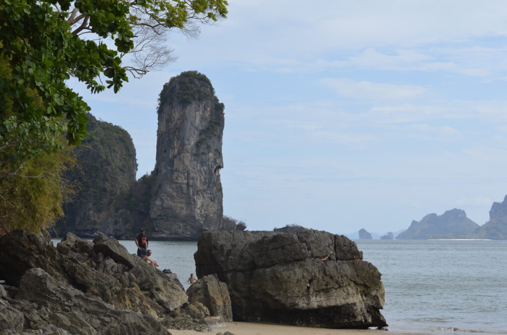 Op een dag gaan we naar Railay Beach, een exotisch juweel aan de Andamanse Zee, je kunt er alleen per boot komen, als we zijn gearriveerd, zijn we diep onder de indruk van de prachtige omgeving.